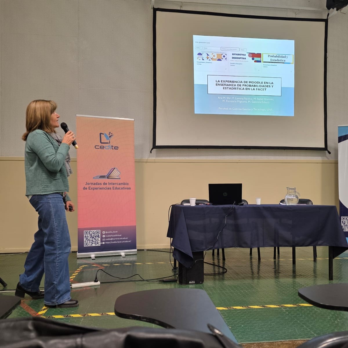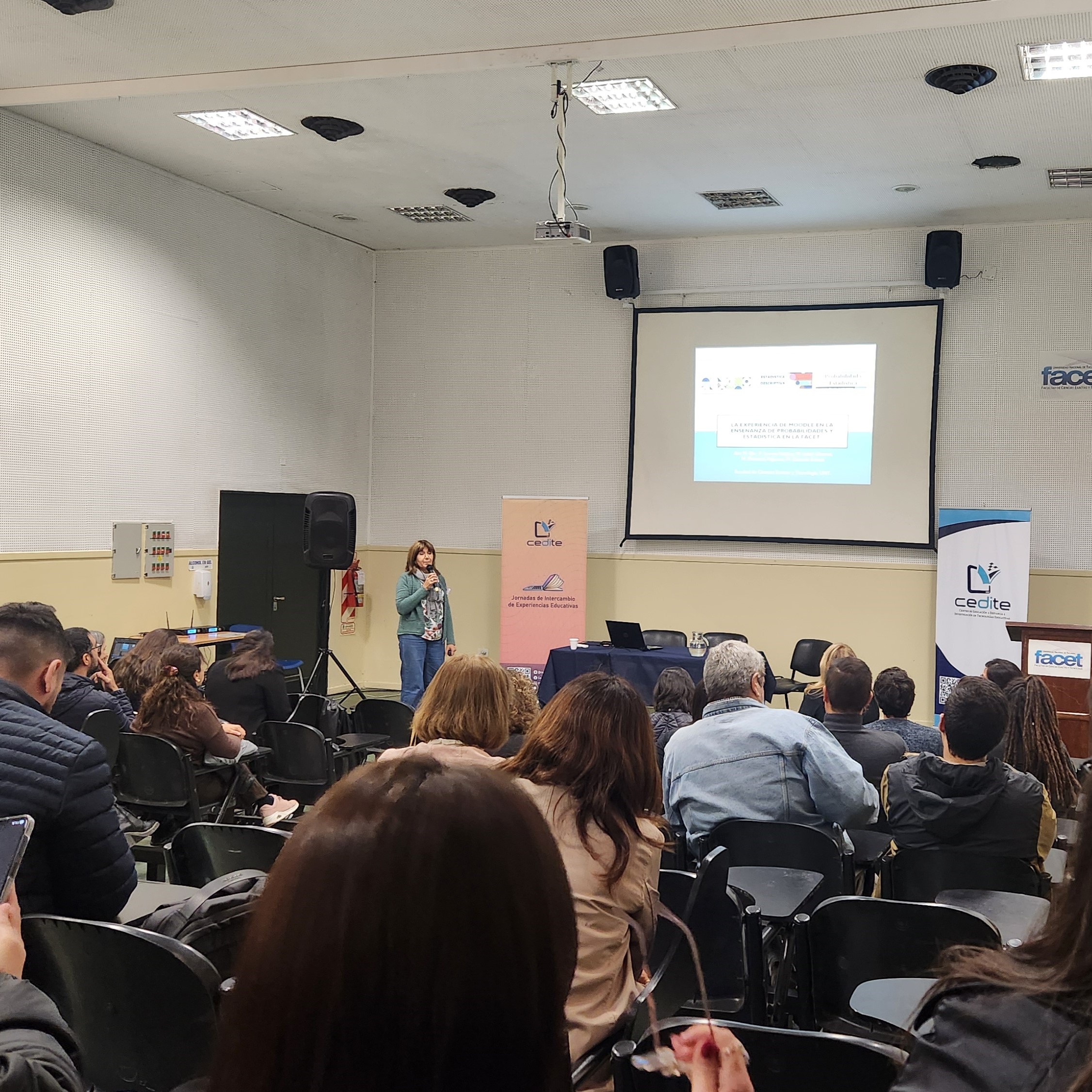 Este viernes 30 de octubre la Dra. Ana María Sfer hizo la presentación del trabajo “La experiencia de moodle en la enseñanza de Probabilidades y Estadística en la FACET” en la IV Jornadas de Intercambio de Experiencias Educativas organizadas por el Centro de Educación a Distancia e Investigación en Tecnologías Educativas (CEDITE).