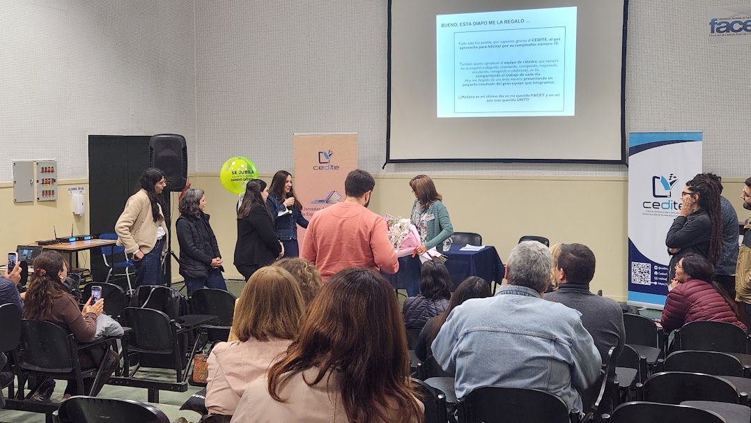 Al finalizar la exposición sus compañeras de cátedra le hicieron un presente por ser su último día de trabajo debido a que comienza su Jubilación a partir del mes de noviembre.