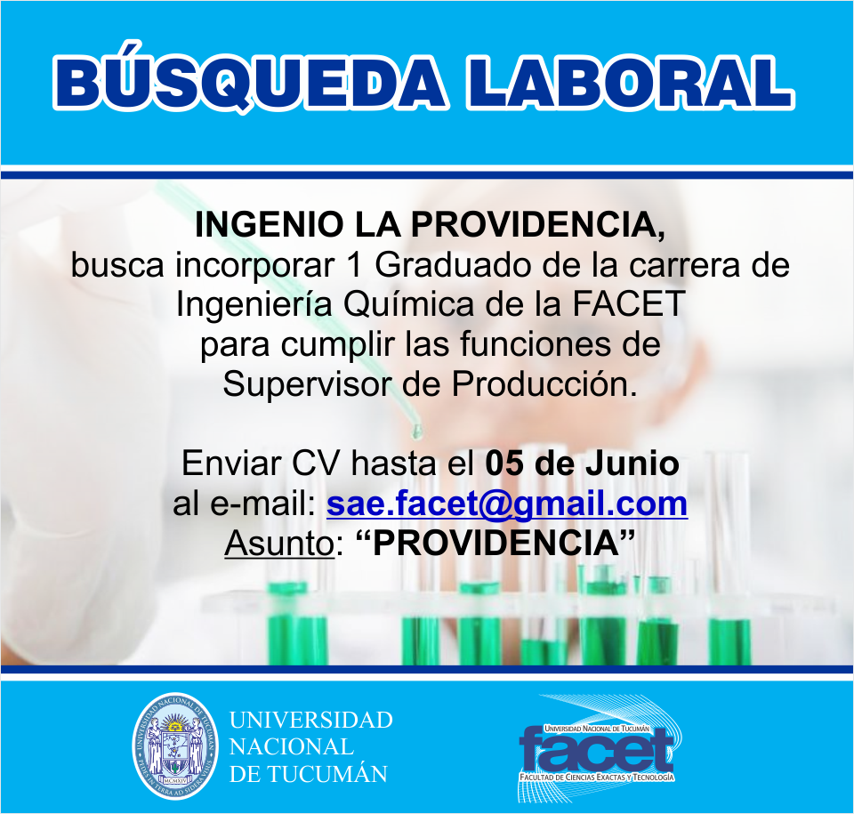 INGENIO LA PROVIDENCIA busca incorporar 1 (un) Graduado/a de la carrera de Ingeniería Química de la FACET para cumplir las funciones de Supervisor de Producción.