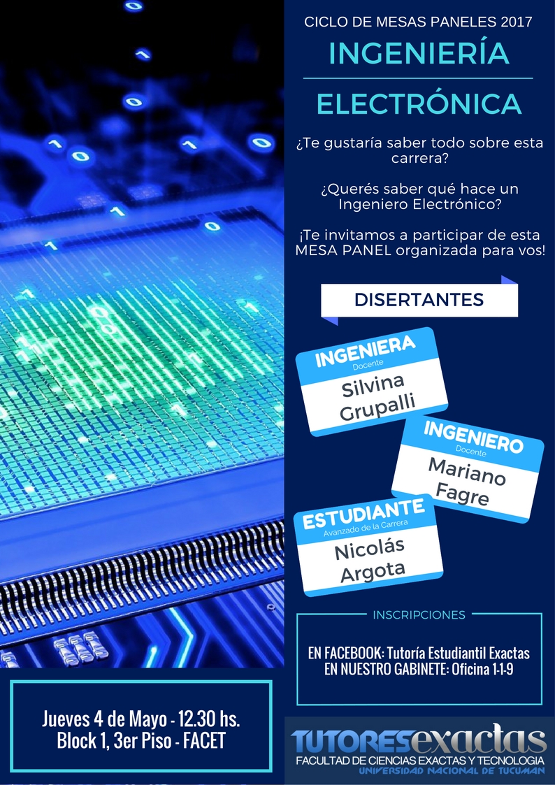 Se invita al público en general a participar de la Mesa Panel de las carreras de Ingeniería Eléctrica y Electrónica, a desarrollarse el día Jueves 4 de Mayo, a las 12.30 hs., en el Block 1, 3er piso.