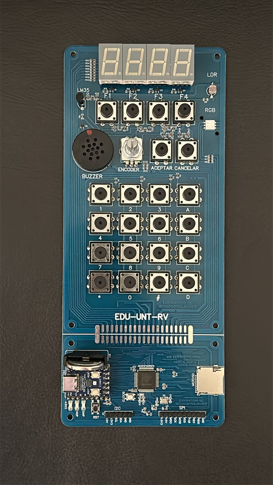 La EDU-UNT-RV fue desarrollada en conjunto con el Laboratorio de Electrónica y está basada en el microcontrolador GD32VF103CBT6 de Global Devices, con un procesador RISC-V de 32 bits a 104 MHz, 128 KBytes de memoria FLASH y 32 KBytes de RAM. Además, incorpora una completa gama de periféricos: pantalla de 4 dígitos de 7 segmentos, teclado matricial de 4x4, seis teclas directas, sensores de temperatura y luz, parlante con salida PWM, LED RGB y lector de tarjetas SD, entre otros.