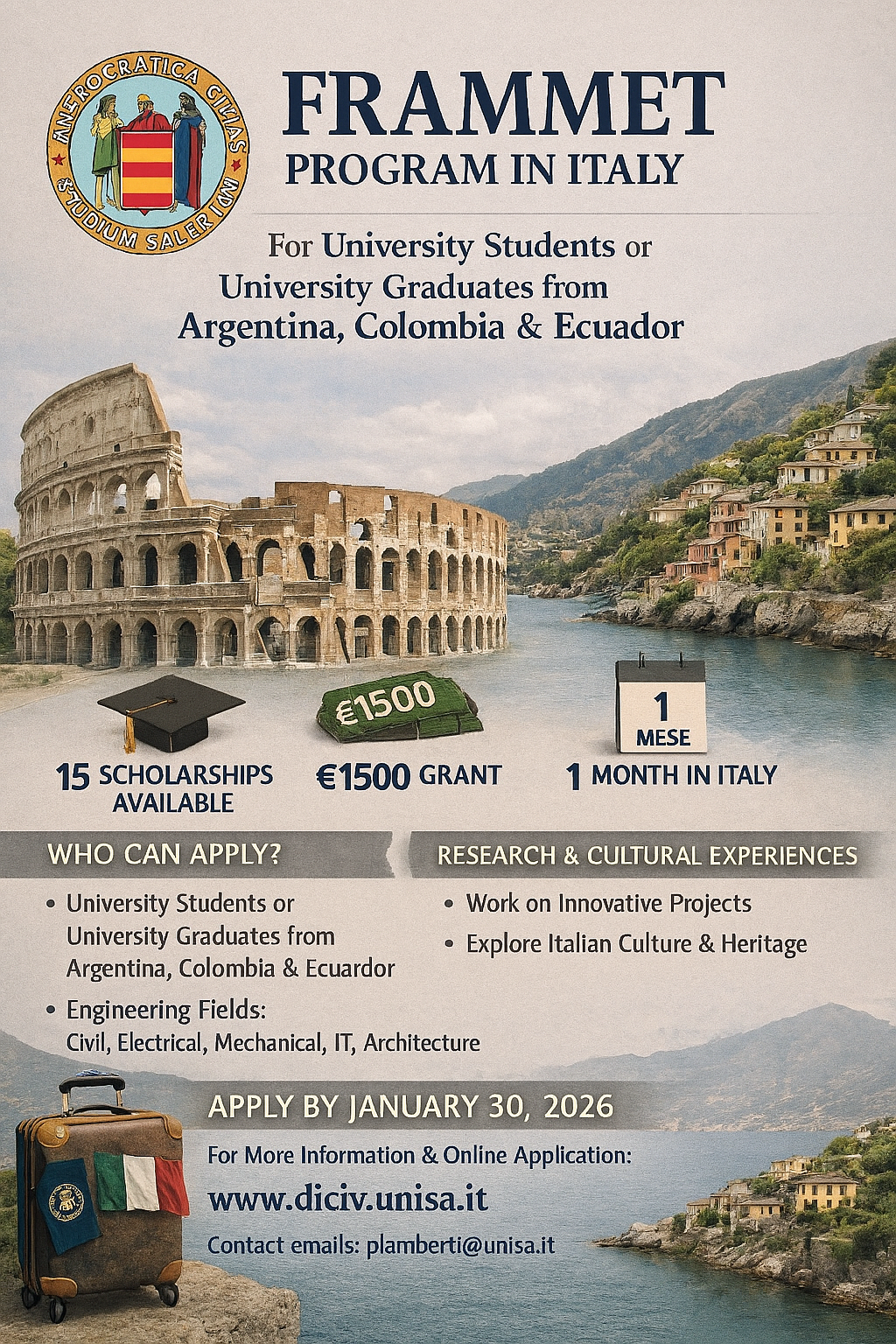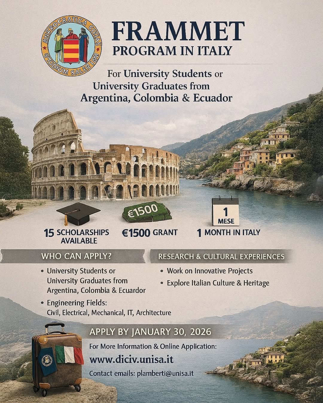 Convocatoria de becas de investigación promovida por la Universidad de Salerno (Italia), en el marco del proyecto internacional FraMMET – Fragility, Marginality, Mobility, Energy Transition.