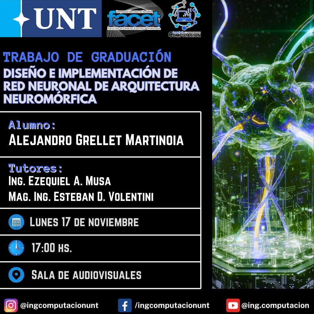 Se invita a estudiantes, docentes, egresados y público en general a la defensa del Trabajo de Graduación “Diseño e Implementación de Red Neuronal de Arquitectura Neuromórfica” a cargo del alumno Alejandro Grellet Martinoia.