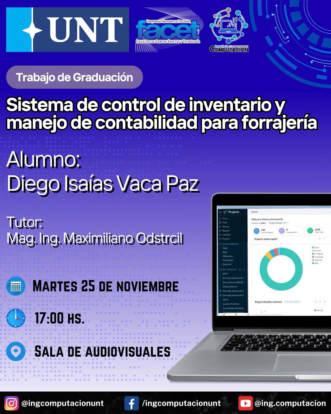 Se invita a estudiantes, docentes, egresados y público en general a la defensa del Trabajo de Graduación “Sistema de control de inventario y manejo de contabilidad para forrajería” a cargo del alumno Diego Isaías Vaca Paz.