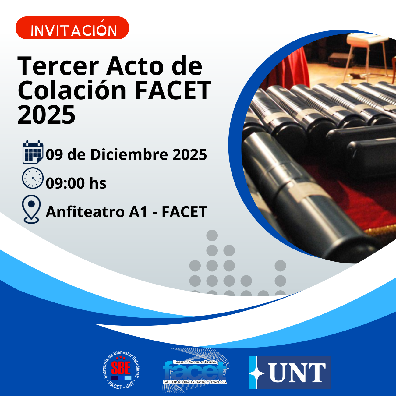 Durante la misma se entregarán 53 títulos de grado y pregrado. Al listado de graduados se lo puede ver accediendo al siguiente link: https://www.facet.unt.edu.ar/sbe/wp-content/uploads/sites/77/2025/12/Colacion-FACET-09_12_25.png