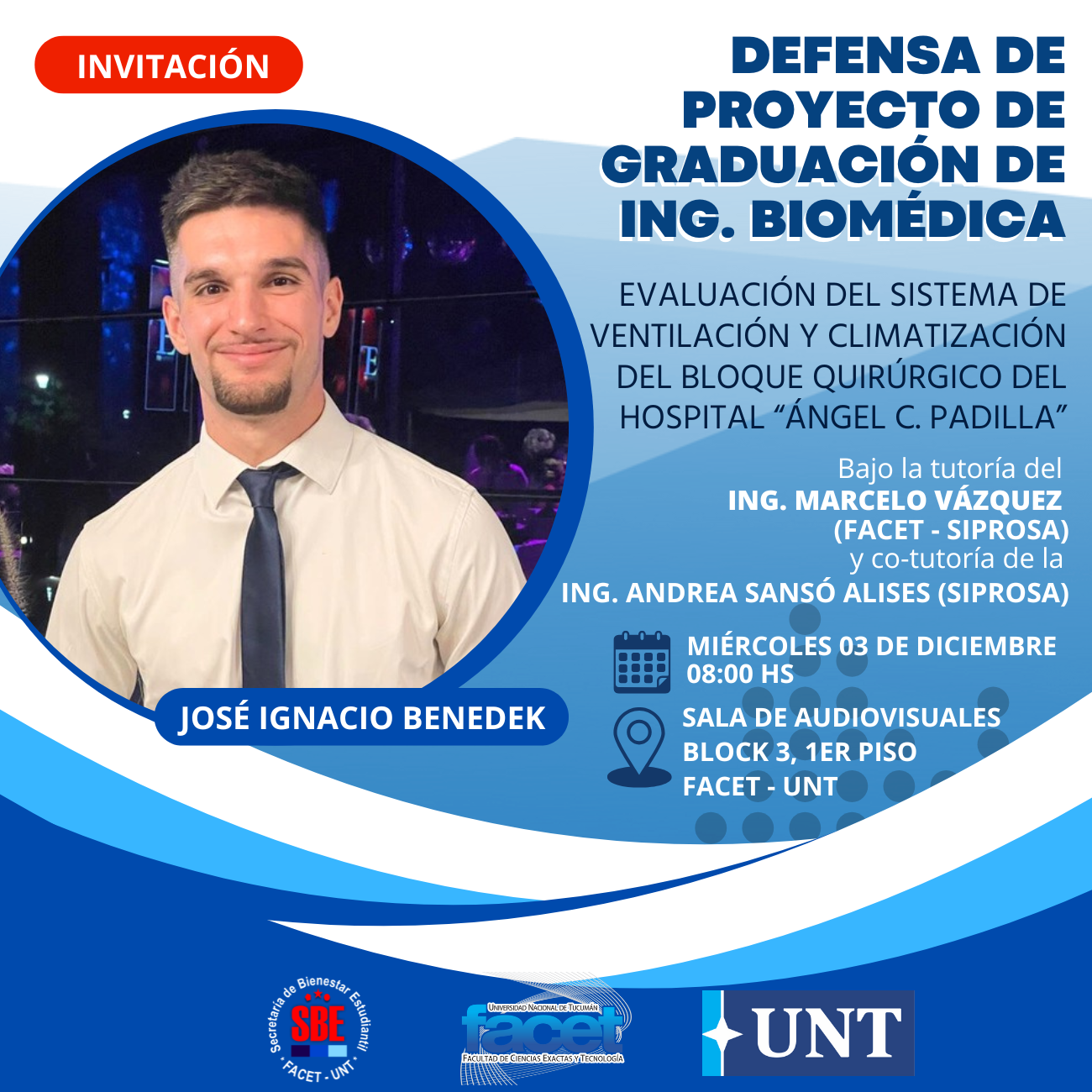 Se invita a alumnos, graduados e interesados a participar de la Defensa del Proyecto de Graduación del alumno José Ignacio Benedek, titulado “Evaluación del sistema de ventilación y climatización del bloque quirúrgico del Hospital “Ángel C. Padilla””, para obtener el título de grado de Ingeniero Biomédico, FACET – UNT.