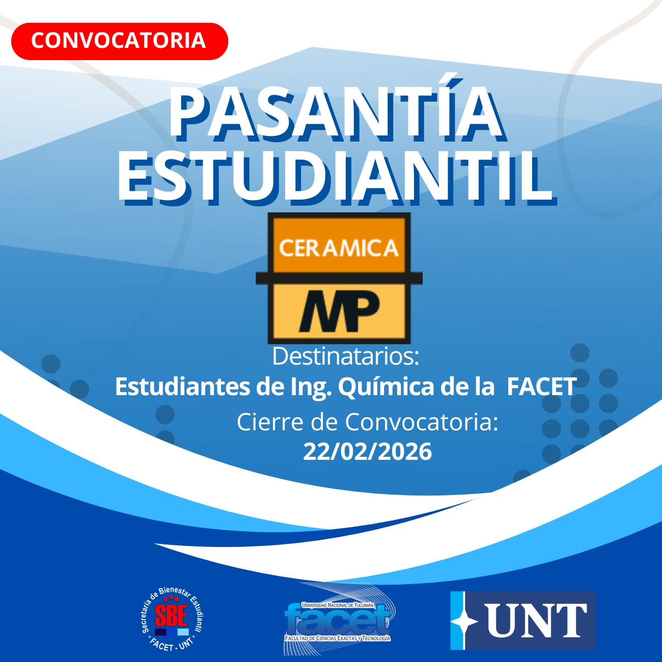 Cerámica Marcos Paz se encuentra en la búsqueda de estudiantes avanzados de la carrera de Ingeniería Química de la FACET, para desempeñarse como pasantes.