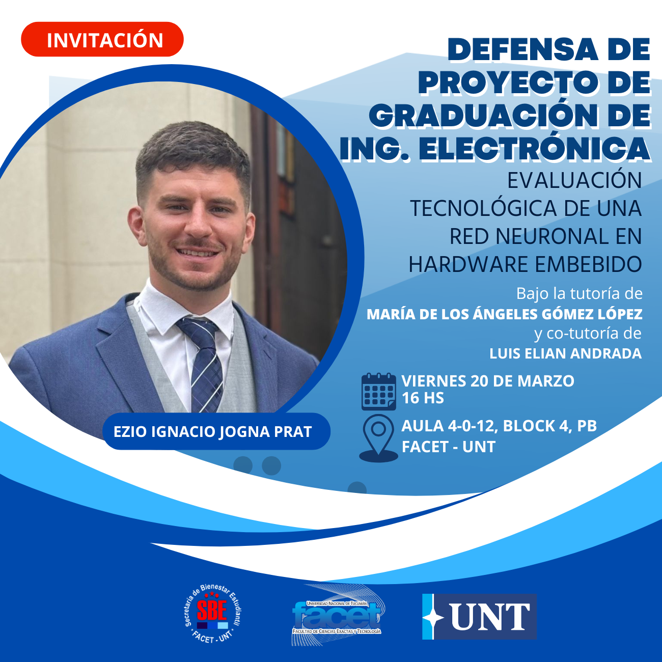 Se invita a alumnos, graduados e interesados a participar de la Defensa del Proyecto de Graduación del alumno Ezio Ignacio Jogna Prat, titulado “Evaluación tecnológica de una red neuronal en hardware embebido”, para obtener el título de grado de Ing. Electrónico, FACET – UNT.