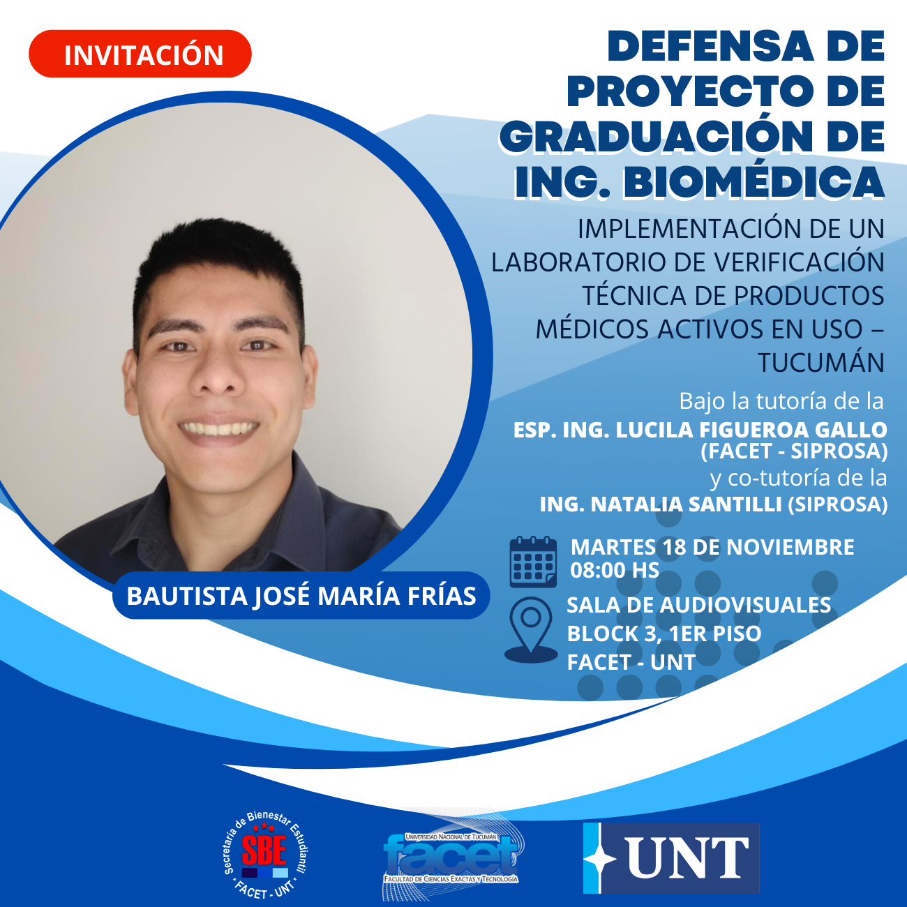 Se invita a alumnos, graduados e interesados a participar de la Defensa del Proyecto de Graduación del alumno Bautista José María Frías, titulado “Implementación de un Laboratorio de Verificación Técnica de Productos Médicos Activos en uso – Tucumán”, para obtener el título de grado de Ingeniero Biomédico, FACET – UNT.