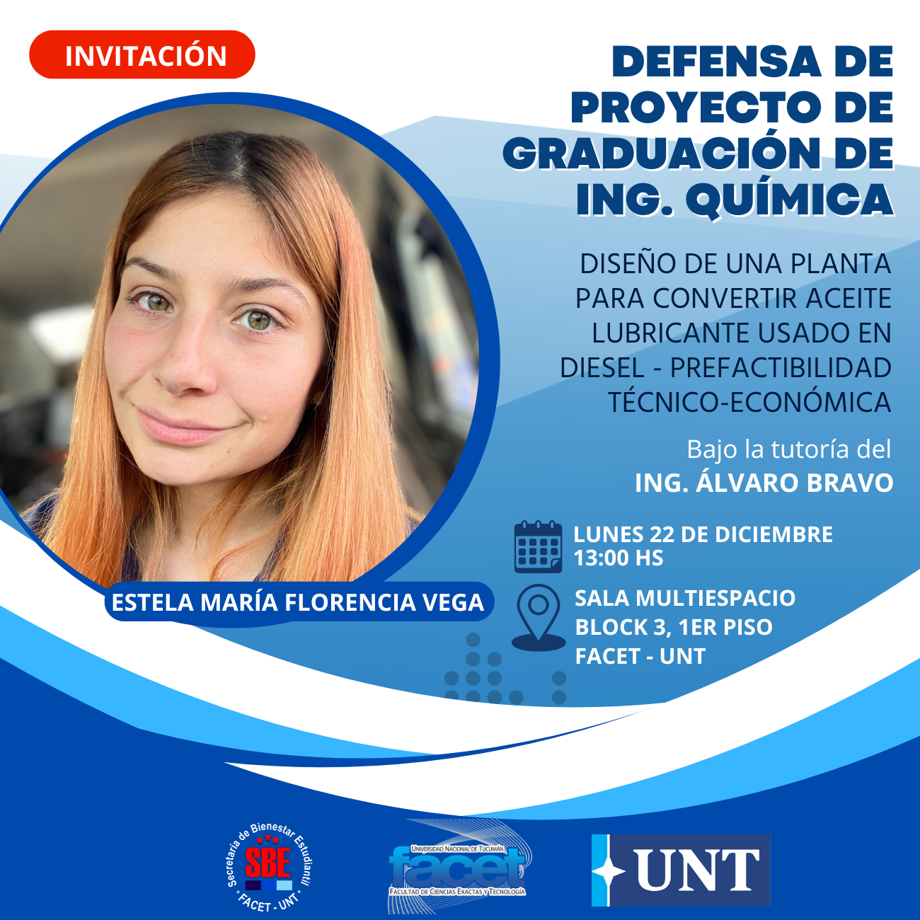 Se invita a alumnos, graduados e interesados a participar de la Defensa del Proyecto de Graduación de la alumna Estela María Florencia Vega , titulado “DISEÑO DE UNA PLANTA PARA CONVERTIR ACEITE LUBRICANTE USADO EN DIESEL - PREFACTIBILIDAD TÉCNICO-ECONÓMICA”, para obtener el título de grado de Ingeniera Química, FACET – UNT.